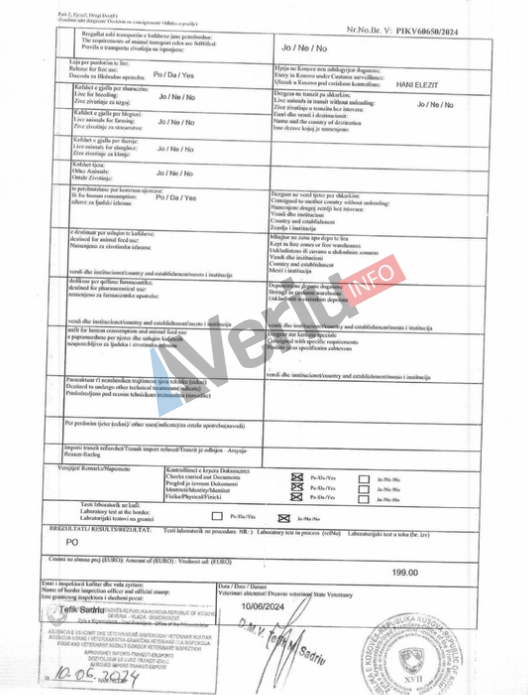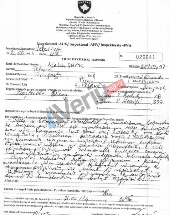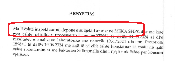 Se mishi i importuar nga Rumania ka qenë në depon e kompanisë “MEKA” Sh.P.K., dëshmohet edhe përmes faqes së dytë të vendimit të AUV, ku thuhet: “Malli është inspektuar në deponë e subjektit afarist ‘MEKA’ Sh.P.K. dhe këtë rast është përpiluar procesverbali me numër 029641 më datë 21.06.2024 …”