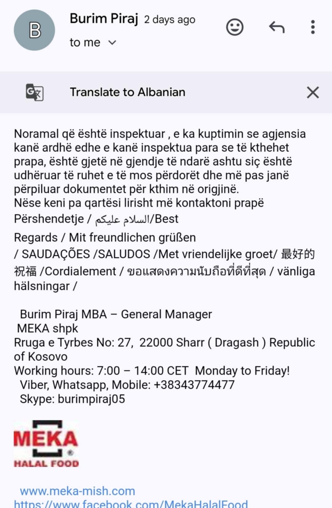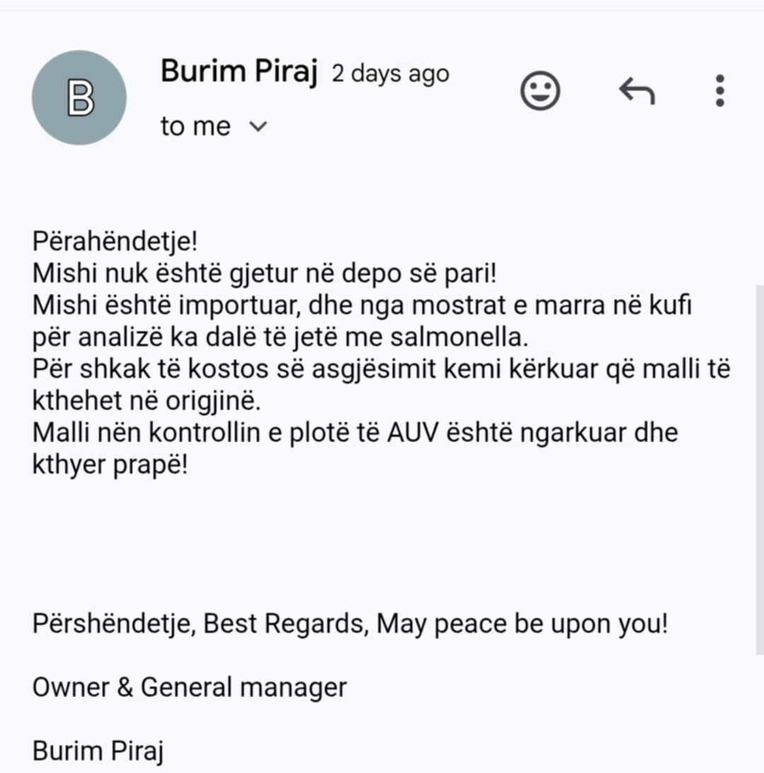 Veriu.info i kishte dërguar prapë pyetje Burim Piraj, duke i prezantuar dokumentin e AUV që mishi ishte inspektuar në depon e kompanisë së tij, ku ai në përgjigjen e dytë nuk e mohon, por thotë: “Normal që është inspektuar , e ka kuptimin se agjensia kanë ardhë edhe e kanë inspektua para se të kthehet prapa, është gjetë në gjendje të ndarë ashtu siç është udhëruar të ruhet e të mos përdorët dhe më pas janë përpiluar dokumentet për kthim në origjinë. Nëse keni pa qartësi lirisht më kontaktoni prapë.”