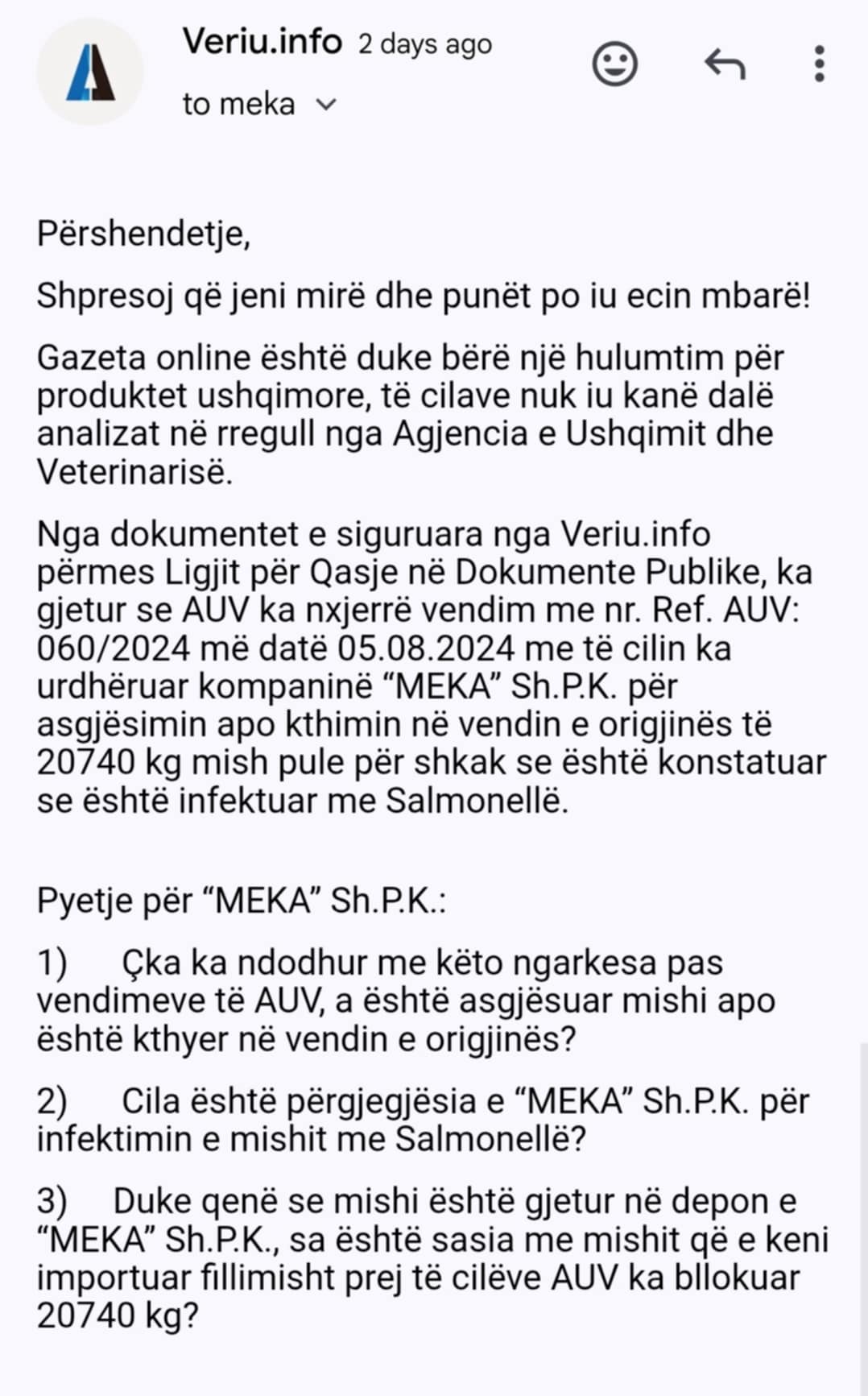 Në kuadër të hulumtimit për kompanitë që kanë futur ose tentuar të fusin produkte ushqimore në Kosovë me përbërës të rrezikshëm, Veriu.info ka publikuar dje një artikull për skandalin e zbulimit të AUV të 20 tonë mish te kompania “MEKA” të kontaminuar me bakteren salmonella.