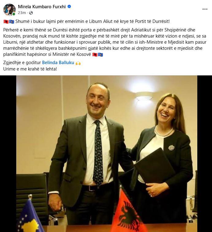 “Shumë i bukur lajmi për emërimin e Liburn Aliut në krye të Portit të Durrësit! Përherë e kemi thënë se Durrësi është porta e përbashkët drejt Adriatikut si për Shqipërinë dhe Kosovën, prandaj nuk mund të kishte zgjedhje më të mirë për ta mishëruar këtë vizion e ndjesi, se sa Liburni, një atdhetar dhe funksionar i sprovuar publik, me të cilin si ish-Ministre e Mjedisit kam pasur marrëdhënie të shkëlqyera bashkëpunimi gjatë kohës kur edhe ai drejtonte sektorët e mjedisit dhe planifikimit hapësinor si Ministër në Kosovë. Zgjedhje e goditur Belinda Balluku. Urime e me krahë të lehta!”, ka shkruar ministrja Kumbaro-Furxhi.