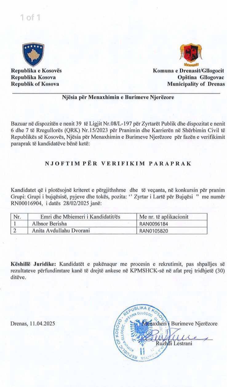 Në këtë konkurs dy kandidatë i plotësuan kushtet.