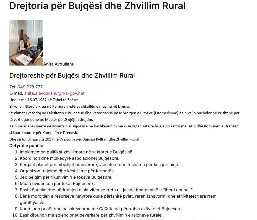 Aty shkruan se Anita Avdullahu është drejtoreshë për Bujqësi dhe Zhvillim Rural.