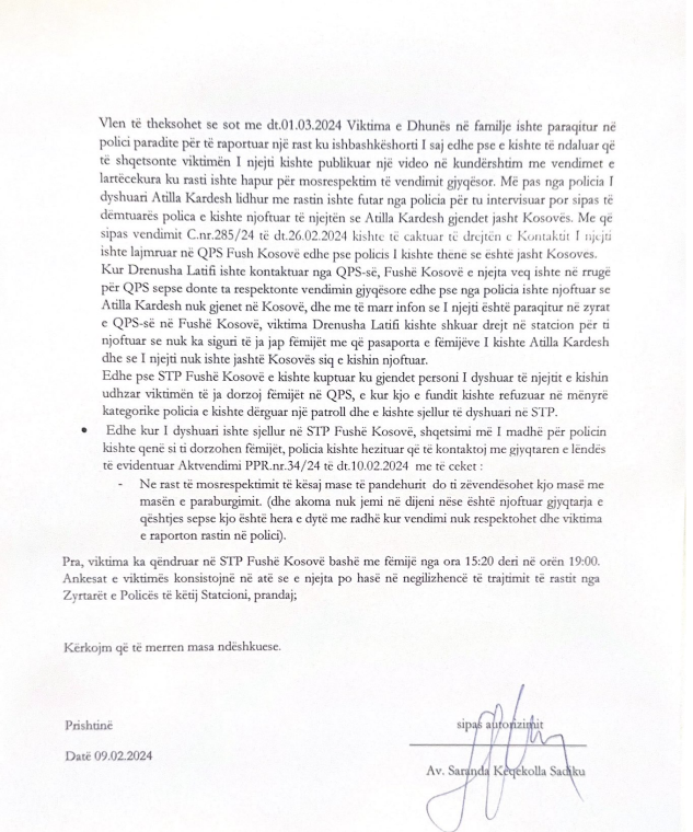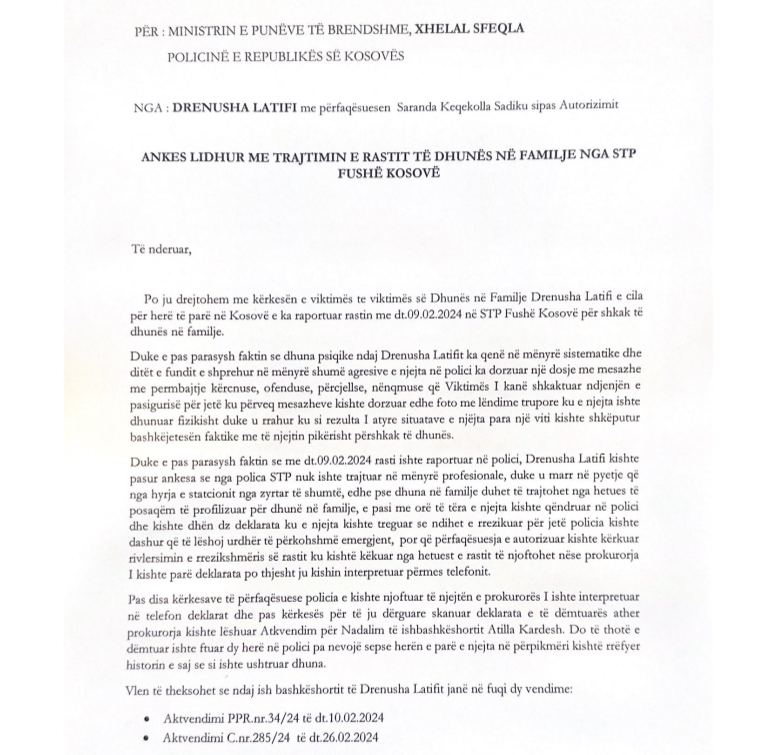 “Ankesat e viktimës konsistojnë në atë se e njëjta po hasë në neglizhencë të trajtimit të rastit nga Zyrtarët e Policisë së Stacionit në Fushë Kosovë. Prandaj kërkojmë që të merren masa ndëshkuese”, thuhet në letër.
