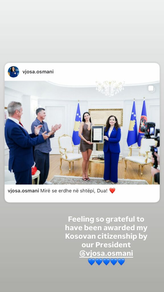 “Ndihem shumë mirënjohëse që më është dhënë shtetësia e Kosovës nga presidentja jonë, Vjosa Osmani”, u shpreh Dua, duke ndarë postimin e presidentes.