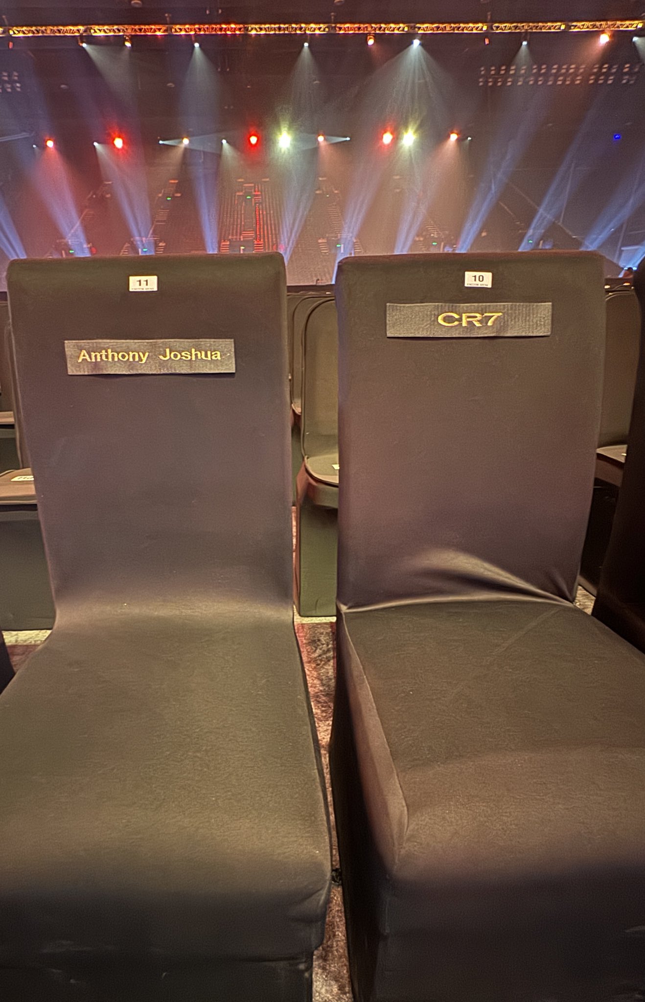 Anthony Joshua dhe Cristiano Ronaldo pritet të jenë të pranishëm, pasi në fotografinë e publikuar nga “Sky Sports Boxing” shihen ulëset me emrat e tyre.