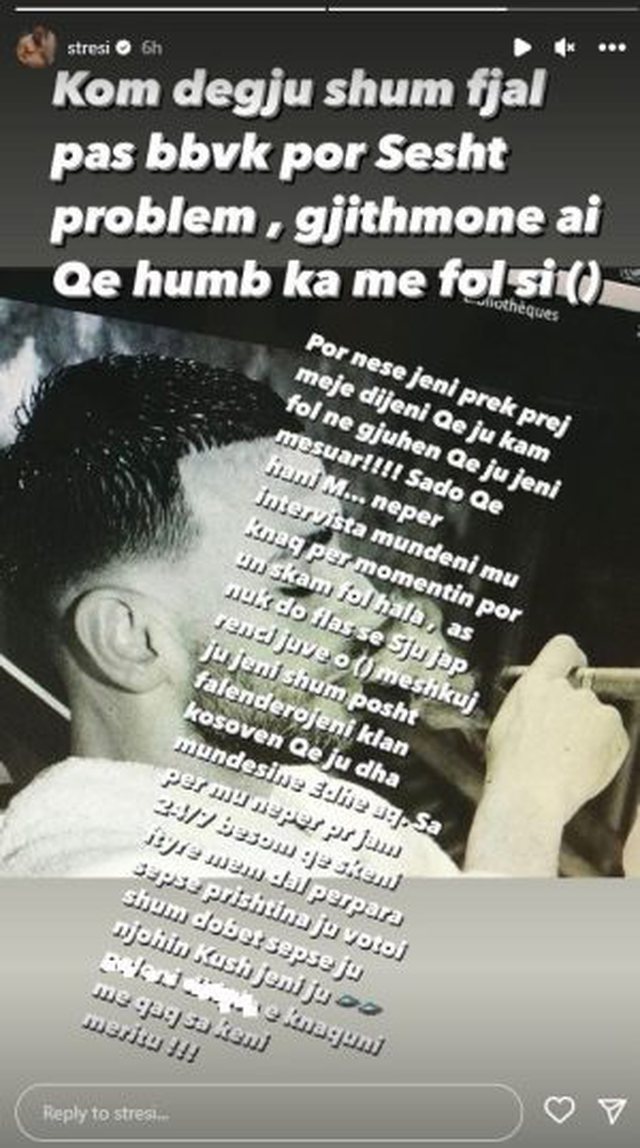 “Kam dëgjuar shumë fjalë pas “Big Brother VIP Kosova”, por nuk është problem, gjithmonë ai që humb ka me fol.Por nëse jeni prekur prej meje dijeni që ju kam folur në gjuhën që ju jeni mësuar. Sado që hani m*t nëpër intervista mundeni me u kënaq por unë nuk kam folur akoma, as nuk do të flas se nuk ju jap rëndësi juve o meshkuj. Ju jeni shumë poshtë, falënderojeni Klan Kosovën që ju dha mundësinë edhe aq. Sa për mua nëpër Prishtinë jam 24/7 besomni që nuk keni fytyrë të më dilni përpara sepse Prishtina ju votoi shumë dobët sepse ju njohin kush jeni. Kënaquni me aq sa keni merituar”, ka shkruar Stresi.