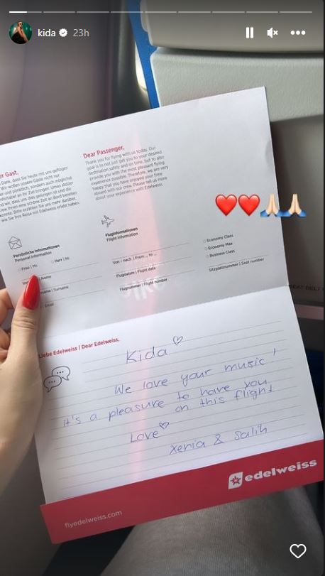 Kida, e cila është goxha aktive në rrjetet sociale, ka zbuluar së fundmi një surprizë që i është bërë gjatë udhëtimit të saj me avion. Dy pasagjerë të huaj, të cilët duket se ishin fansa të muzikës së Kidës, e kanë njohur këngëtaren në avion dhe me këtë rast i kanë dërguar një letër ku shprehin dashurinë dhe vlerësimi n që kanë për të.