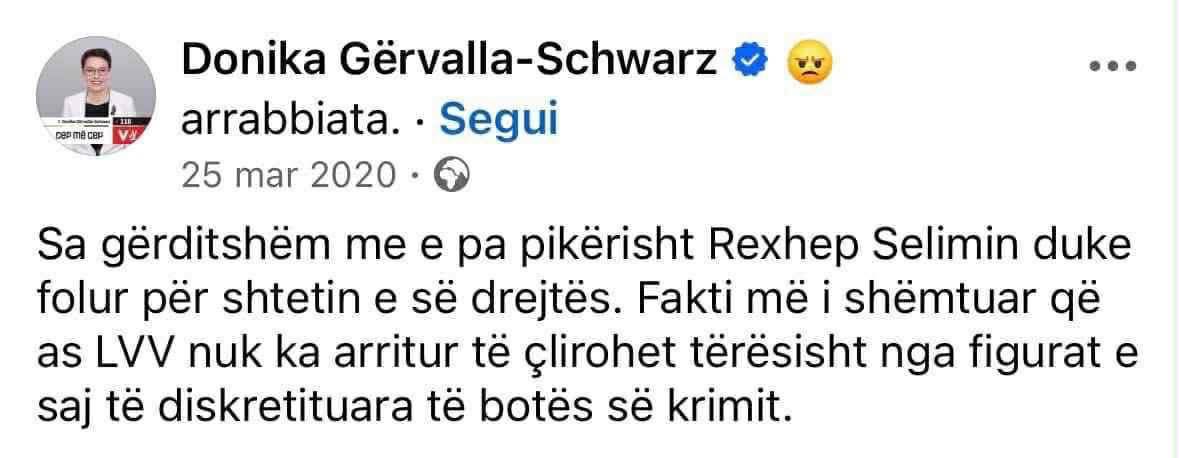 “Sa gërditshëm me pa pikërisht Rexhep Selimin duke folur për shtetin e së drejtës. Fakti më i shëmtuar që as LVV nuk ka arritur të çlirohet tërësisht nga figurat e saj të diskredituara të botës së krimit”, kishte shkruar ajo për Rexhep Selimin.