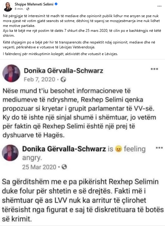 “Në përgjigje të interesimit të madh të mediave dhe opinionit publik lidhur me arsyen se pse nuk mora pjesë në votim gjatë seancës së sotme, dëshiroj të sqaroj se mospjesëmarrja ime nuk lidhet me motive partiake. Ajo ka të bëjë me një postim të datës 7 shkurt dhe 25 mars 2020, të cilin po e bashkëngjis në këtë shkrim. Këtë shpjegim po e bëjë për hir të transparencës dhe respektit ndaj opinionit, mediave dhe në veçanti, përkrahësve e votuesve të Lëvizjes Vetëvendosje. I falënderoj për mirëkuptimin kolegët, aktivistët dhe votuesit e Lëvizjes”, ka shkruar ajo.