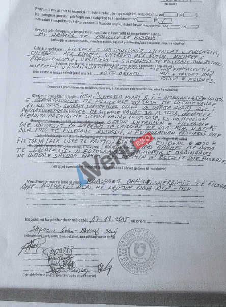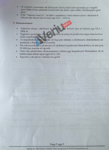 Sipas raportimit të inspektimit, është konstatuar se IPSh “Shpresa Nuraj B.I.”, me pronare Shpresa Nuraj, nuk ka qenë e licencuar për ofrimin e shërbimeve shëndetësore të fillerëve dhe Botox-it.