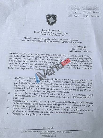 Në mesin e subjekteve private shëndetësore të kontrolluara kishte qenë edhe institucioni privat shëndetësor “Shpresa Nuraj B.I.”, me pronare Dr. Shpresa Nuraj.