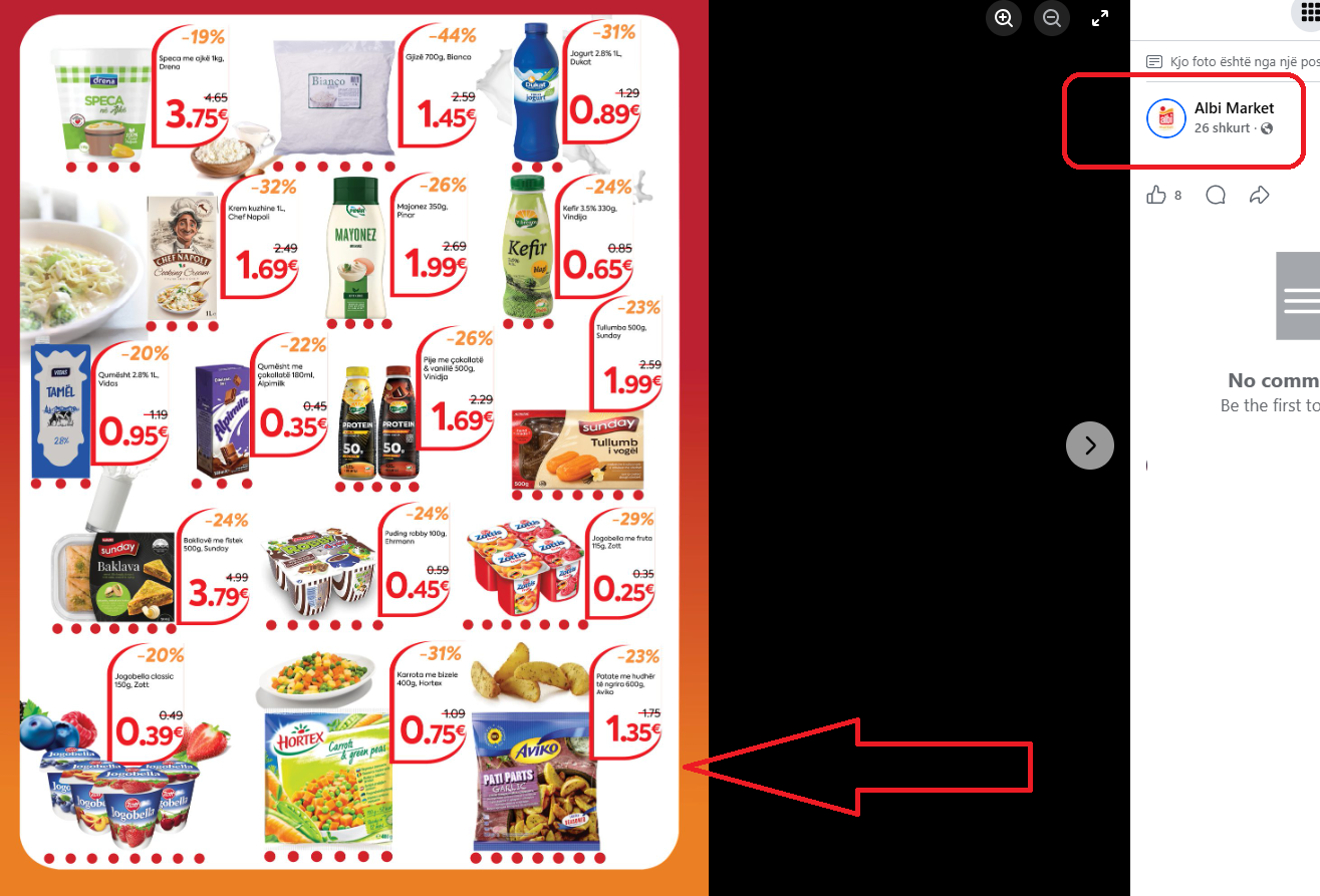 Në ofertën që vlente për periudhën 27 shkurt deri më 5 mars 2026, të prezantuar nga kompania “Albi Shopping” Sh.P.K. në publik, përfshirë edhe rrjetet sociale, çmimi për produktin “Patate me hudhër të ngrira 600g Aviko” ishte 1.35 euro me zbritje nga 1.79, sa ishte çmimi standard.