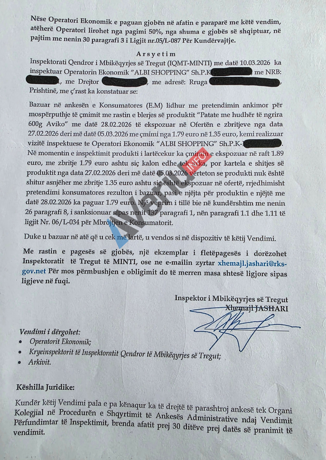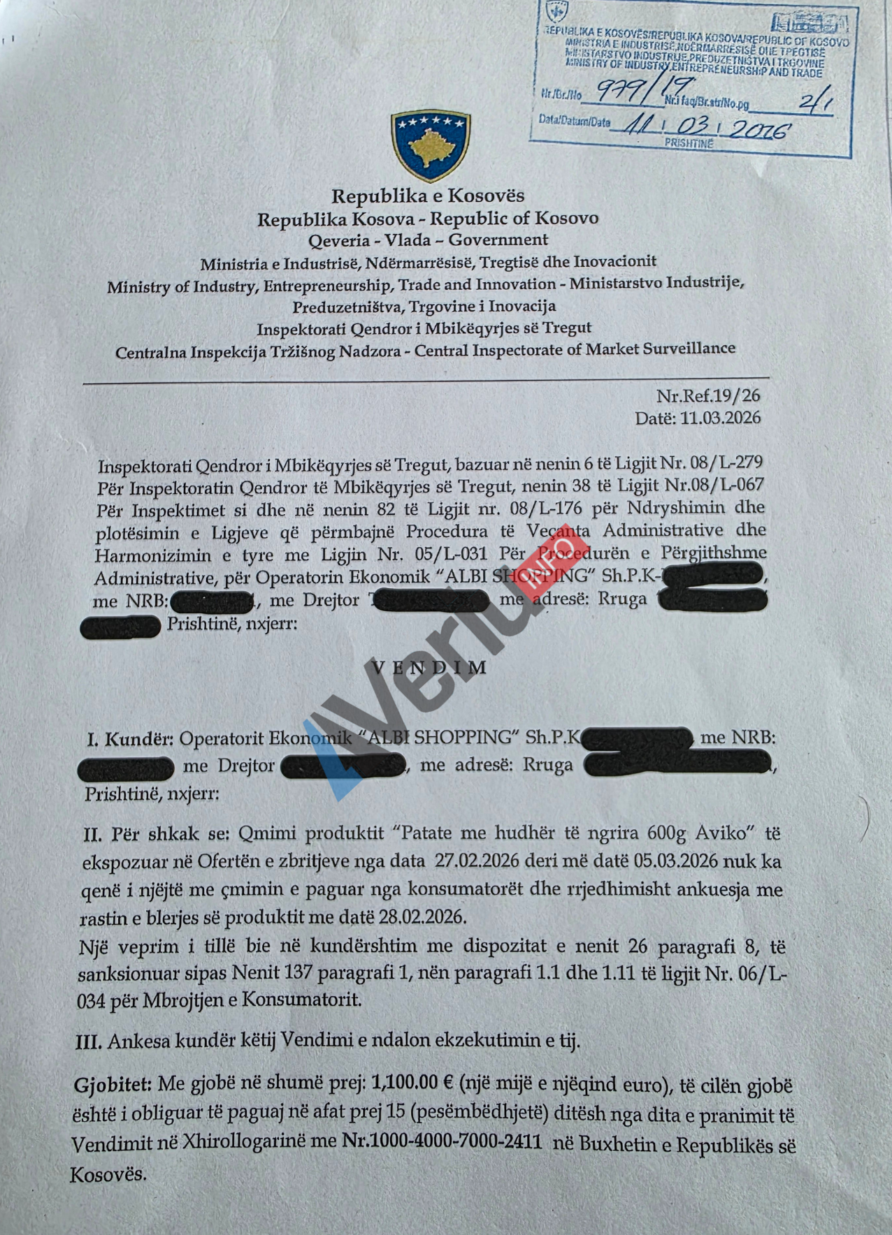 Për shkak të kësaj shkeljeje ligjore që është mashtrim klasik me çmime të produkteve, inspektorët e IQMT-së e kanë gjobitur kompaninë “Albi Shopping” Sh.P.K. me 1 mijë e 100 euro, gjobë të cilën nëse e paguan brenda afatit prej 15 ditësh lirohet nga 50% e shumës.