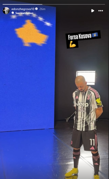 Ylli i ri i Juventusit ka shkruar në Insta Story “Forca Kosova”, me fanellën e “Zonjës së Vjetër” dhe në prapavijë me flamurin e Kosovës.