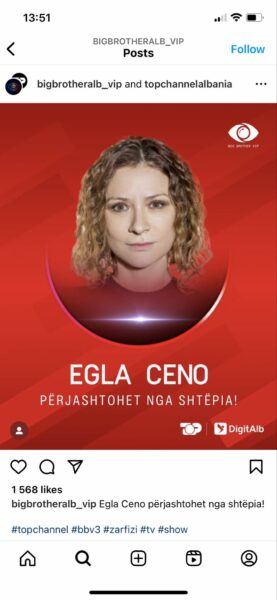 Egla Ceno është përjashtuar nga gara e Big Brothet Vip Albania.