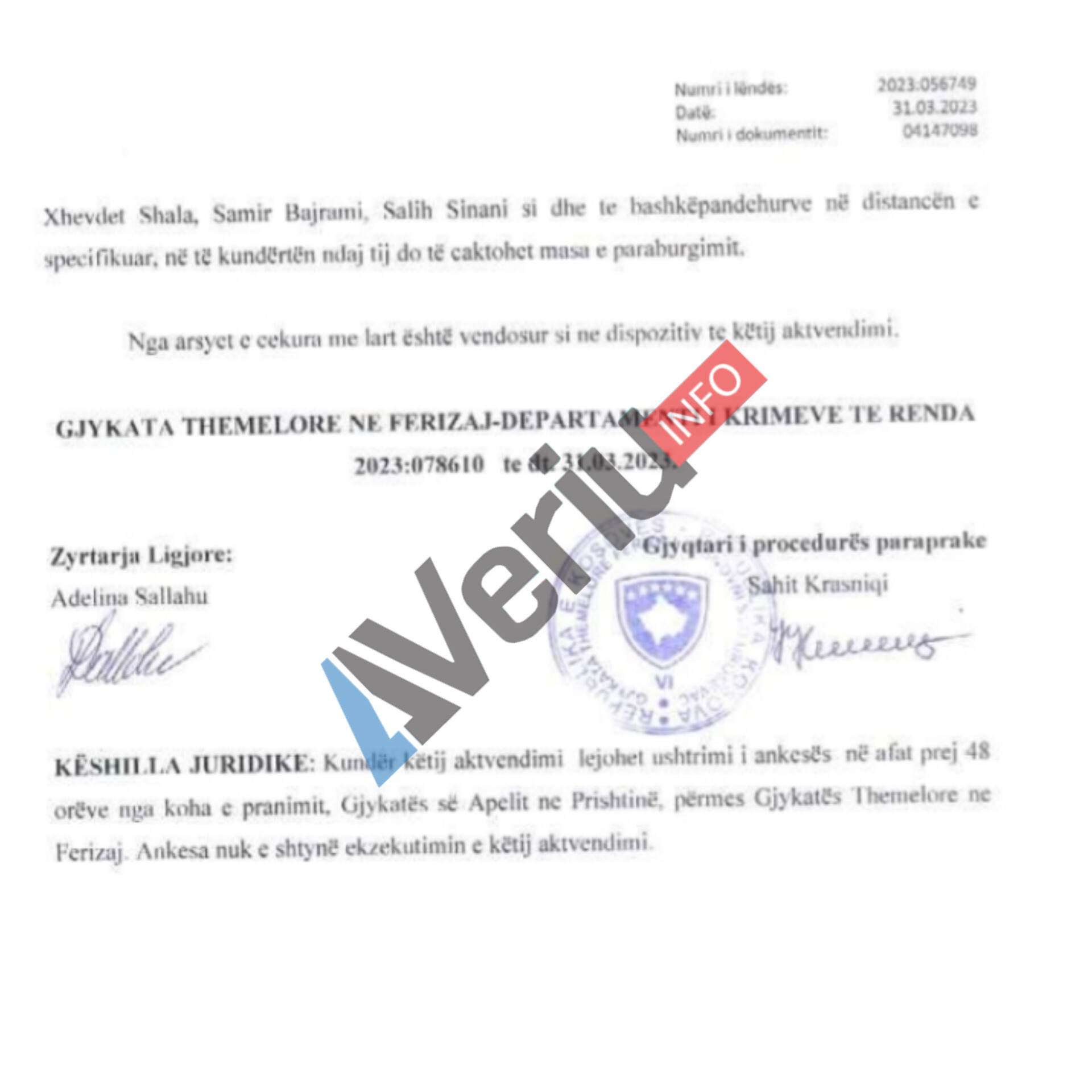 Veriu.info ka siguruar ekskluzivisht aktvendimin e gjyqtarit të procedurës paraprake, Sahit Krasniqi, me të cilin iu vazhdohet masa e paraburgimit edhe për dy muaj këtyre të pandehurve: