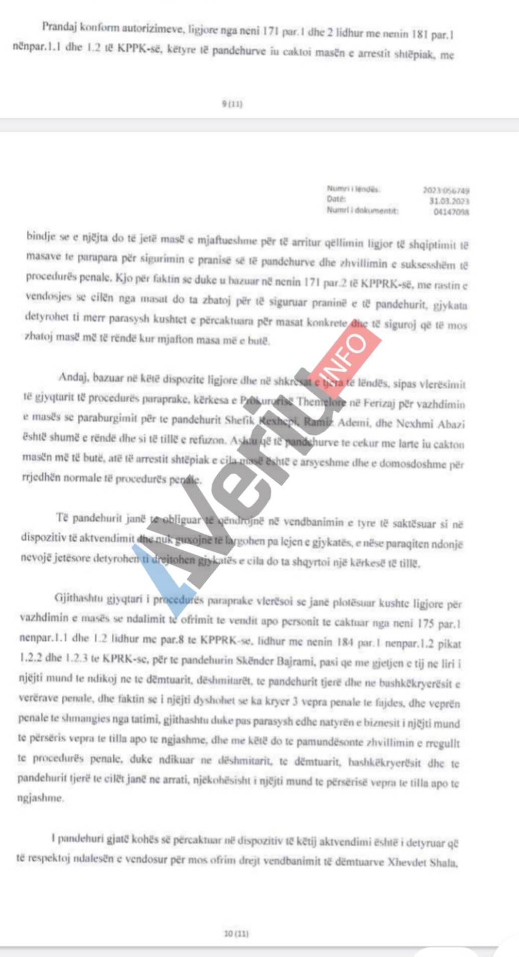 Në këtë aktvendim të gjykatës të siguruar nga gazeta Veriu.info, thuhet se ndaj të pandehurit Skender Bajrami (pronar i autosallon ‘Alberti’) vazhdohet masa e ndalimit të ofrimit të vendit apo personit të caktuar në kohëzgjatje prej dy muajve, duke filluar nga 31.03.2023 deri më 30.05.2023.