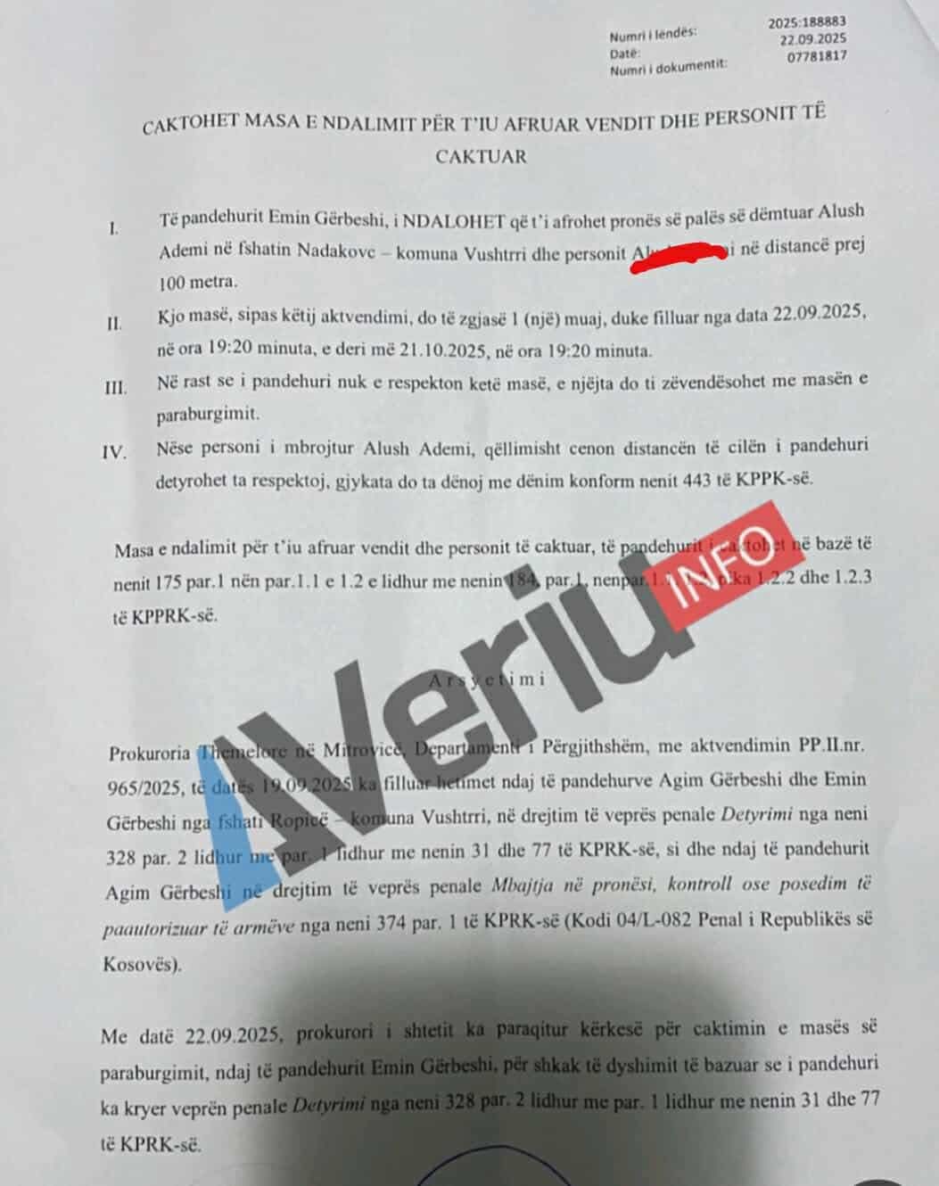 Sipas vendimit të siguruar nga Veriu.info atij i është caktuar masa e ndalimit për t’iu afruar vendit dhe personit të caktuar.