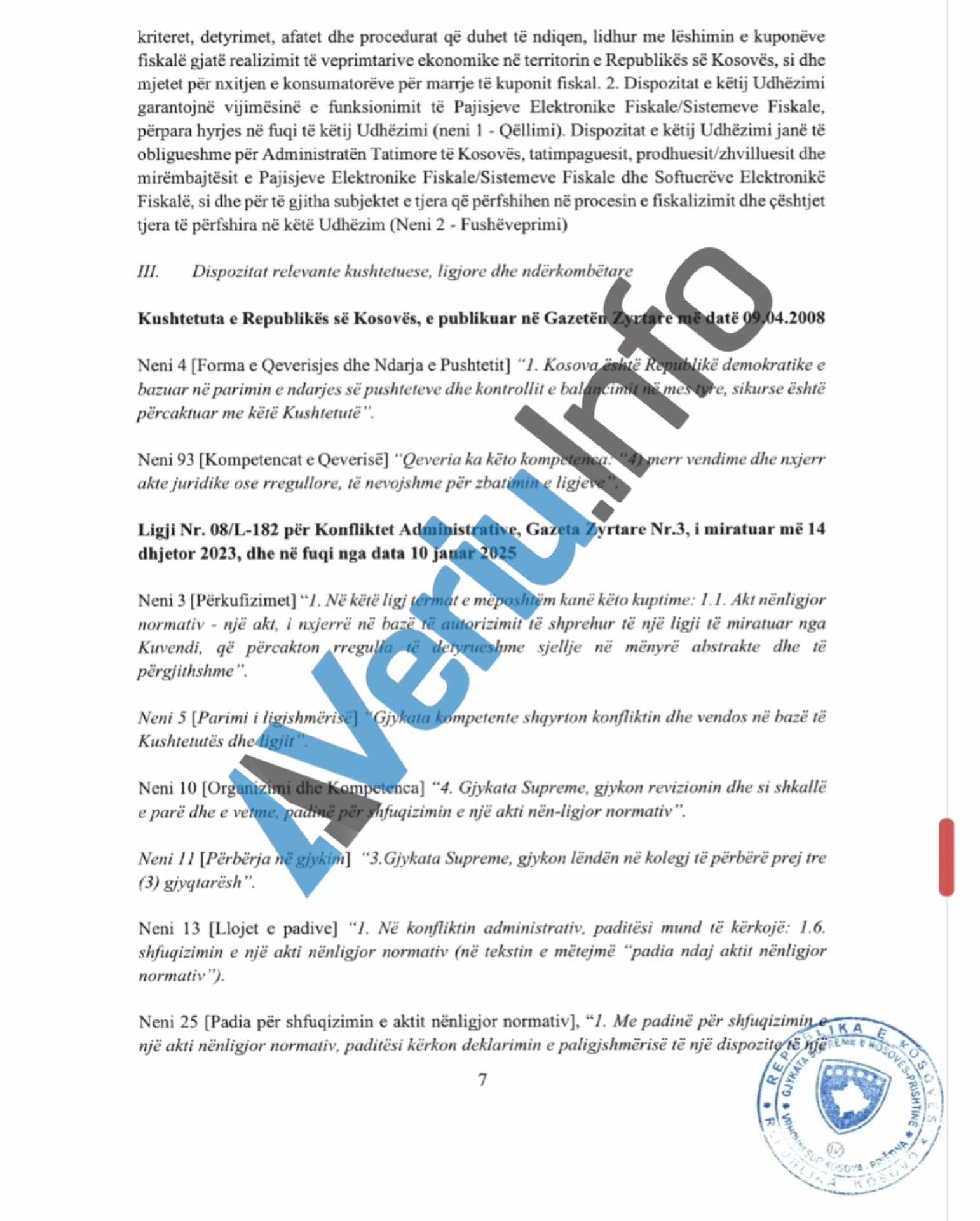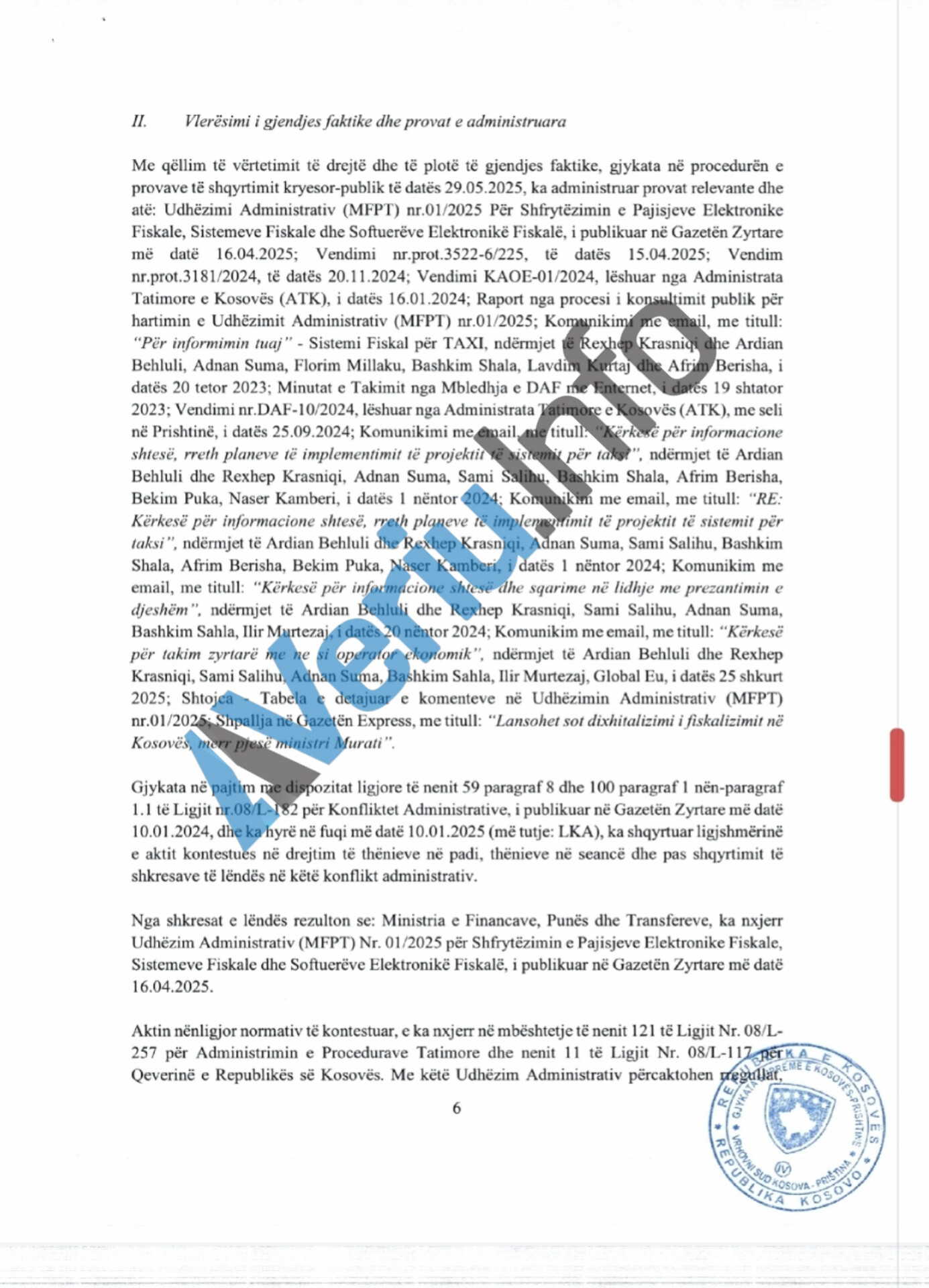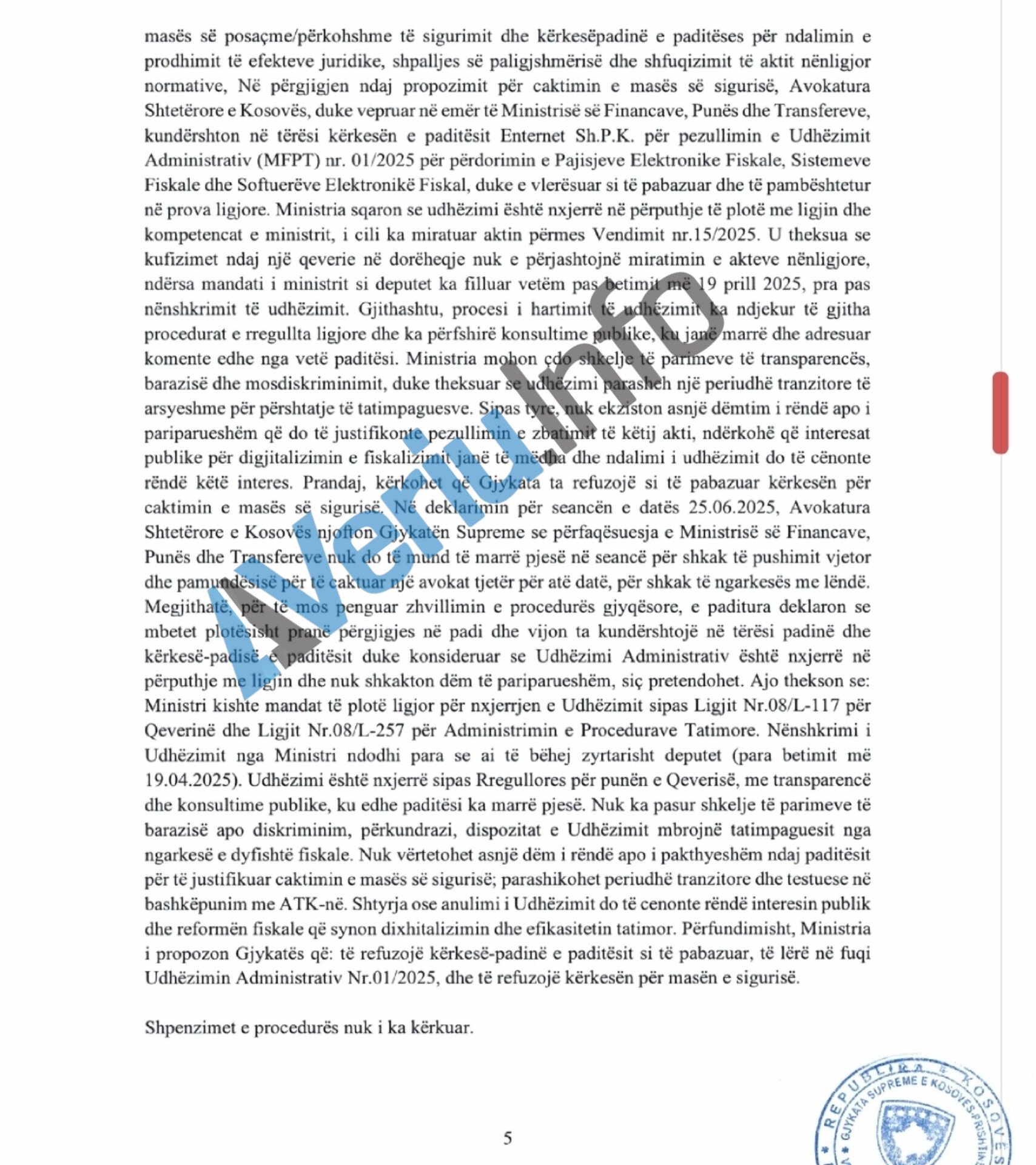 Në një vendim të marrë lidhur me Udhëzimi Administrativ nr. 01/2025 për arkat fiskale digjitale, të nënshkruar nga ministri në detyrë i Financave, Hekuran Murati, Supremja ka vlerësuar se “në përputhje me nenet 28 dhe 29 të Ligjit Nr. 08/L-117 për Qeverinë e Republikës së Kosovës, të cilat përcaktojnë se mandati i Qeverisë përfundon me përfundimin e mandatit katërvjeçar të Kuvendit, si dhe se mandati i anëtarëve të Qeverisë përfundon në rast të zgjedhjes së tyre si deputetë të Kuvendit, gjykata vlerëson se ministri në detyrë përgjegjës për nënshkrimin e aktit nënligjor normativ të kontestuar i ka përfunduar detyrat me përfundimin e mandatit të Qeverisë dhe me momentin e nënshkrimit, përkatësisht publikimit të tij në Gazetën Zyrtare të Republikës së Kosovës”.