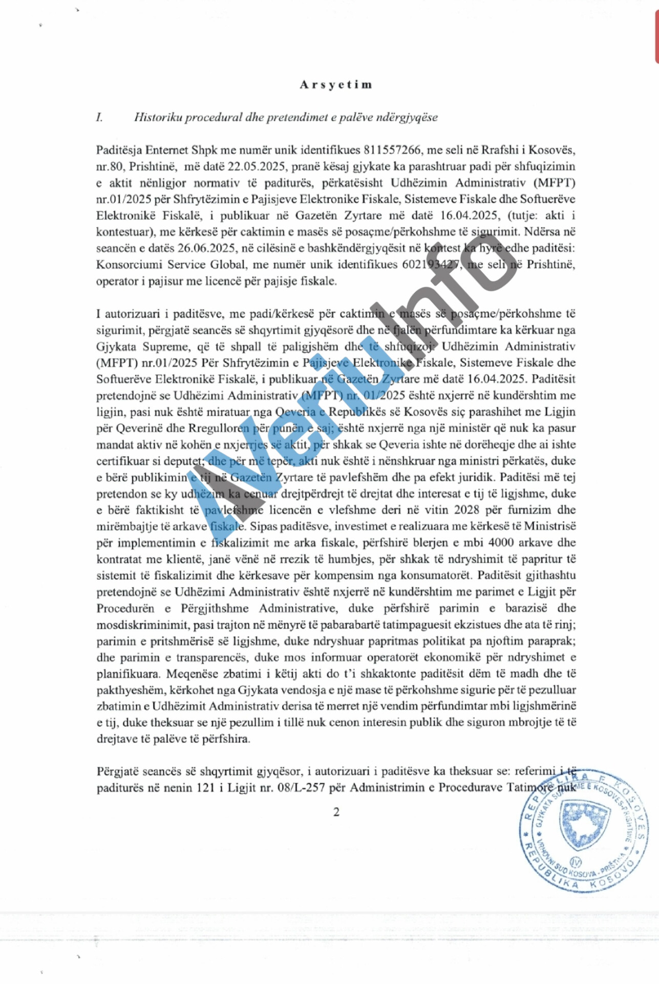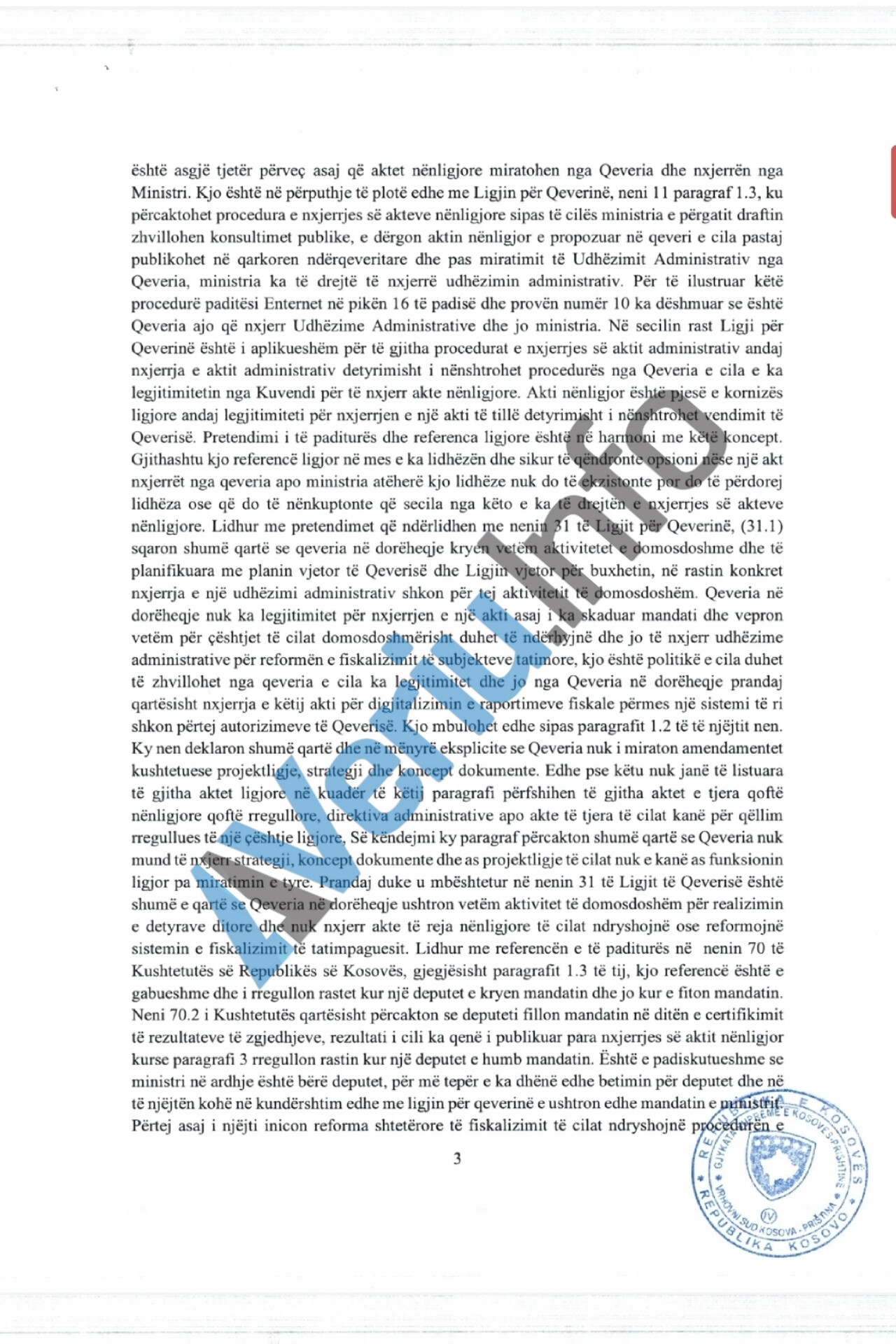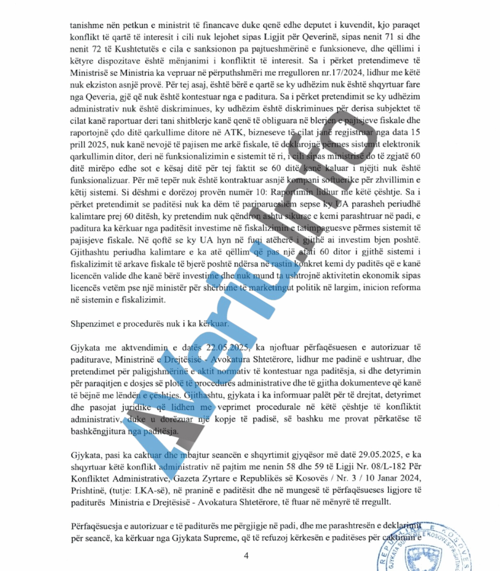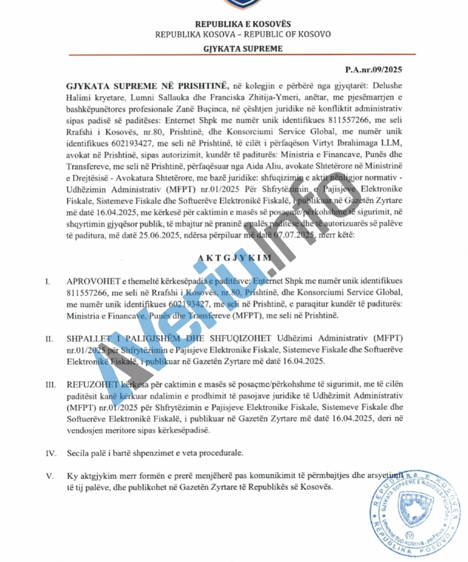Në një vendim të marrë lidhur me Udhëzimi Administrativ nr. 01/2025 për arkat fiskale digjitale, të nënshkruar nga ministri në detyrë i Financave, Hekuran Murati, Supremja ka vlerësuar se “në përputhje me nenet 28 dhe 29 të Ligjit Nr. 08/L-117 për Qeverinë e Republikës së Kosovës, të cilat përcaktojnë se mandati i Qeverisë përfundon me përfundimin e mandatit katërvjeçar të Kuvendit, si dhe se mandati i anëtarëve të Qeverisë përfundon në rast të zgjedhjes së tyre si deputetë të Kuvendit, gjykata vlerëson se ministri në detyrë përgjegjës për nënshkrimin e aktit nënligjor normativ të kontestuar i ka përfunduar detyrat me përfundimin e mandatit të Qeverisë dhe me momentin e nënshkrimit, përkatësisht publikimit të tij në Gazetën Zyrtare të Republikës së Kosovës”.
