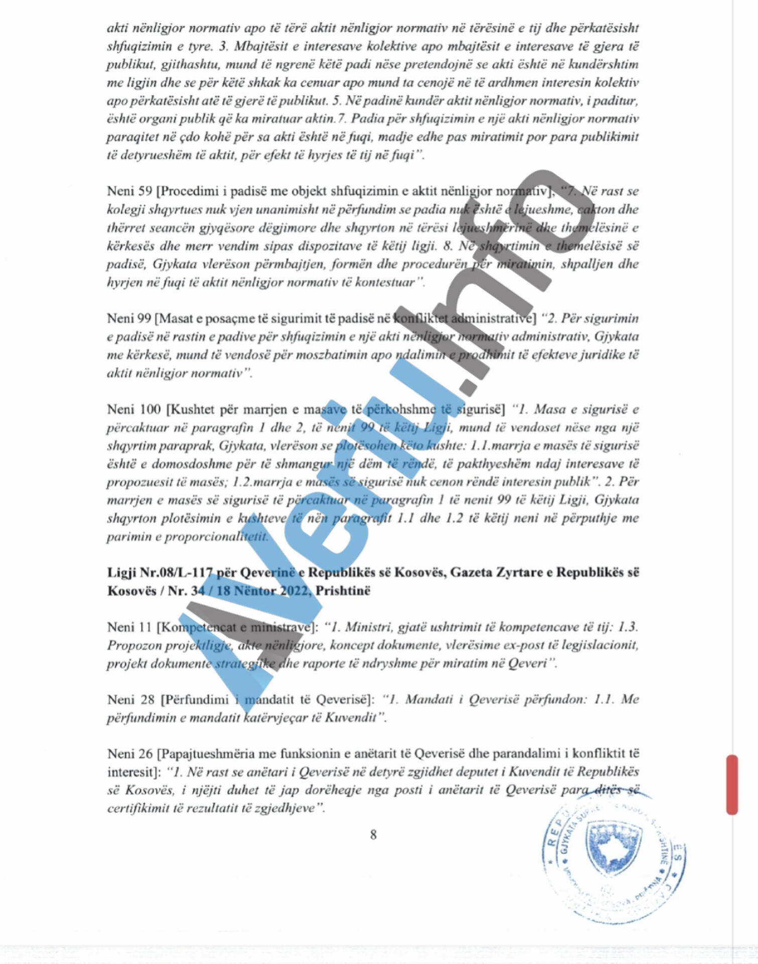 Gjithashtu thuhet se Gjykata nuk ka vlerësuar pretendimet dhe argumentet e tjera, “duke konsideruar se mungesa e autorizimit ligjor dhe mungesa e kompetencës funksionale për nxjerrjen dhe publikimin e aktit nënligjor normativ, përbëjnë shkelje të dispozitave ligjore dhe kushtetuese”.