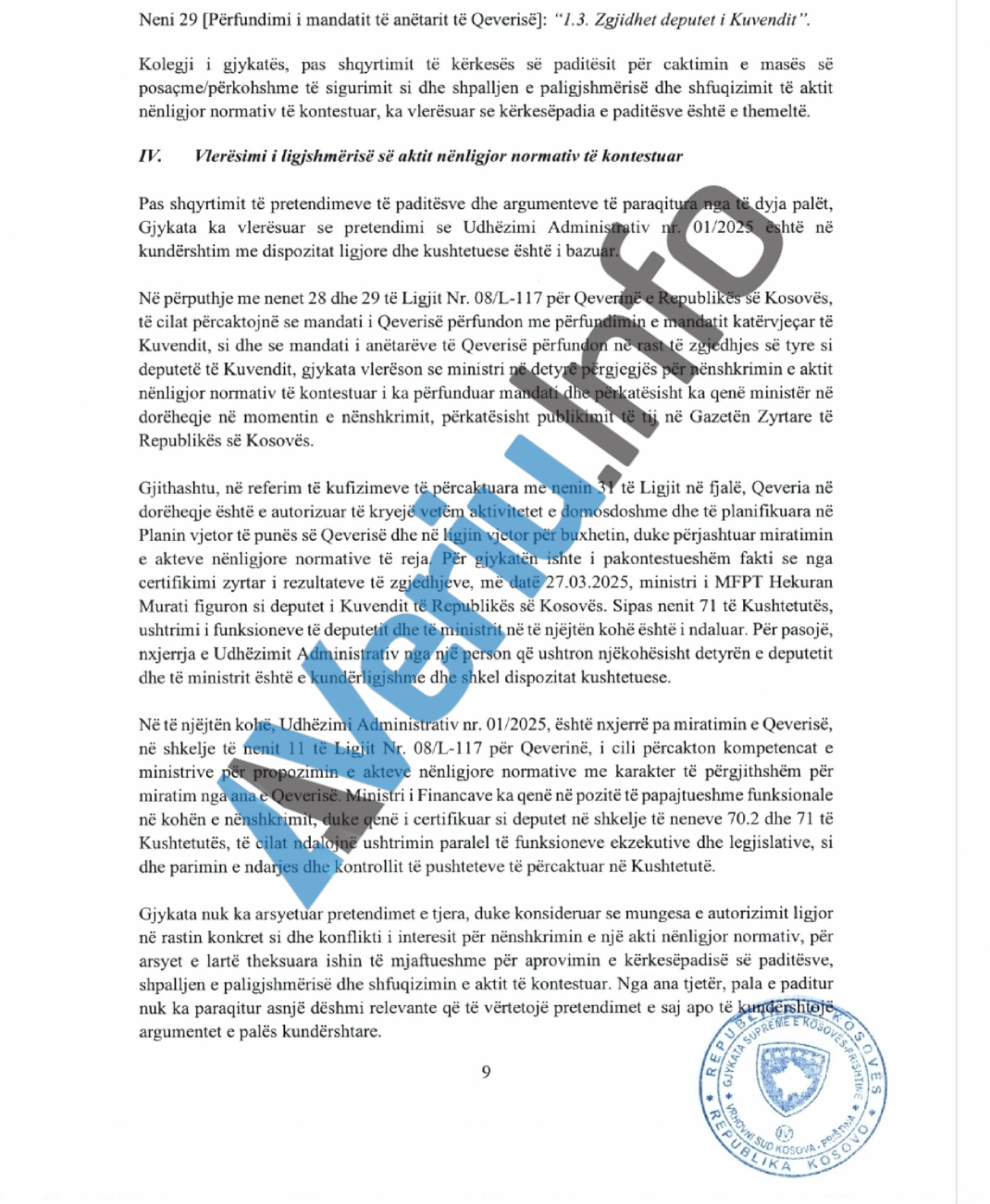 “Për gjykatën ishte i pakontestueshëm fakti se nga certifikimi zyrtar i rezultateve të zgjedhjeve, më datë 27.03.2025, ministri i MFPT Hekuran Murati figuron si deputet i Kuvendit të Republikës së Kosovës. Sipas nenit 71 të Kushtetutës, ushtrimi i funksioneve të deputetit dhe të ministrit në të njëjtën kohë është i ndaluar. Pra, nxjerrja e Udhëzimit Administrativ nga një person që ushtron njëkohësisht detyrën e deputetit dhe të ministrit është e kundërligjshme dhe shkel dispozitat kushtetuese”, thuhet në vendim të siguruar nga Veriu.info.