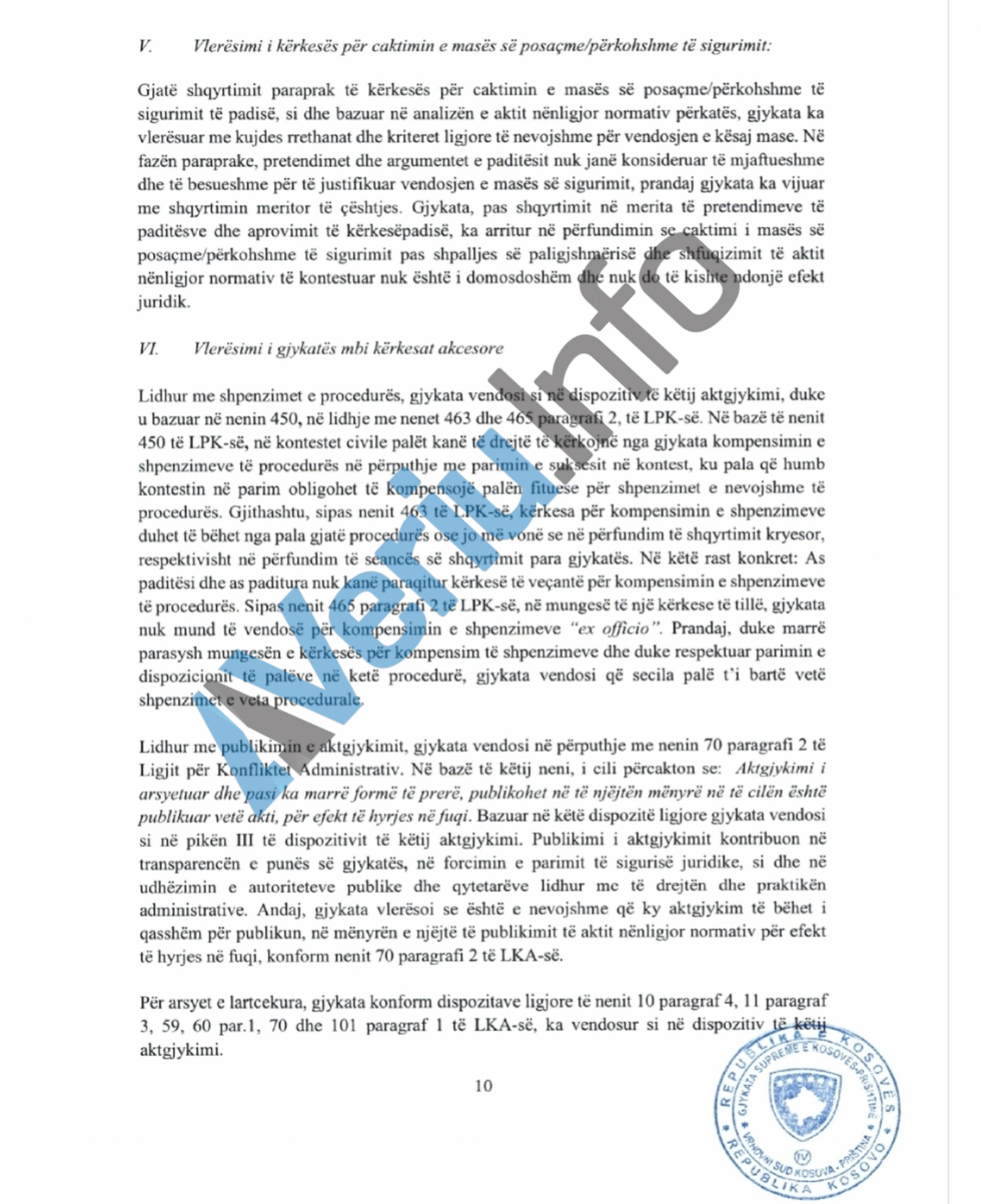 “Prandaj, përderisa akti i kontestuar është nxjerrë nga një autoritet i paautorizuar dhe në mungesë të kompetencës ligjore, si dhe është në kundërshtim me parimet e ndarjes dhe kontrollit të pushteteve, Gjykata vlerëson se akti i kontestuar duhet të shfuqizohet si i kundërligjshëm dhe në shkelje të dispozitave kushtetuese”, thuhet në vendim.