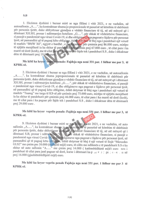 Pronari i auto sallon “Alberti” akuzohet se në fillim të vitit 2021 e në vazhdim e ka dëmtuar biznesmenin Xhevdet Shala, i cili kishte obligime nga pagesat e fajdeve te personat e tjerë, pasi që i dëmtuari është detyruar të blejë nga Skender Bajrami një “Taureg” me çmim prej 75 mijë euro, por të njëjtin menjëherë ia ka shitur Skender Bajramit për 46 mijë euro, duke i marrë këto para kesh e me të cilat ka paguar fajde tek i pandehuri S.S.. Pra, brenda ditës Xhevdet Shala ka humbur 29 mijë euro.
