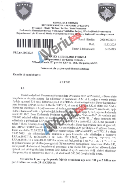 Veriu.info ka siguruar aktakuzën e ngritur nga prokurori Rasim Maloku më 16 dhjetor 2025 ndaj të pandehurit Skender Bajrami, pronar i auto sallon “Alberti”, i cili akuzohet për kryerje të katër (4) veprave penale të fajdes.