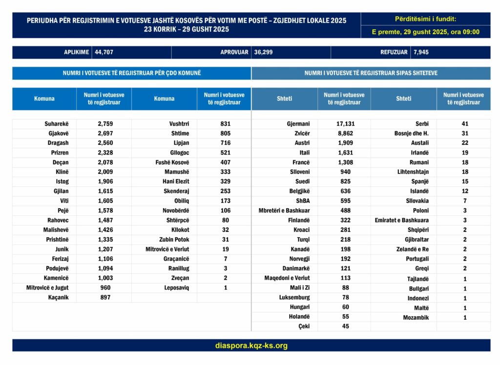 “Nga data 23 korrik dhe deri më 29 gusht 2025 (ora 09:00), përmes platformës elektronike https://diaspora.kqz-ks.org janë pranuar 44,707 aplikime për regjistrim për votim me postë, prej të cilave janë aprovuar 36,299, ndërkaq janë refuzuar 7,945”, ka bërë të ditur Elezi.