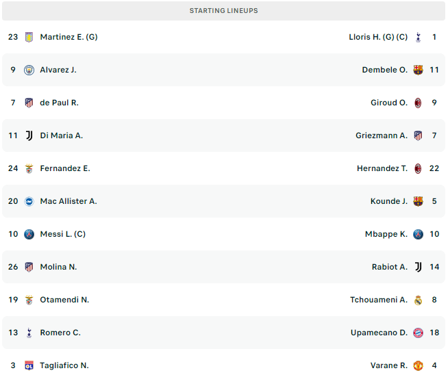 Kështu, për Argjentinën nga minuta e parë ka startuar në portë Emiliano Martinez e ku para tij në mbrojtje janë: Otamendi, Molina, Romero dhe Taglafico. Në mesfushë sot luajnë De Paul, Di Maria, Fernández, Mac Allister kurse sulmit i prin: Messi dhe Álvarez.