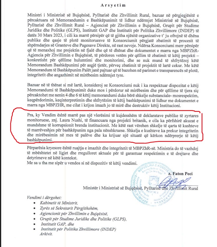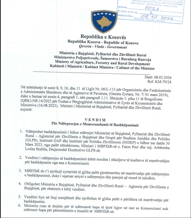 Në vendimin me numër referent KM-70/24, të datës 08.03.2024, thuhet qartë se: “Ndërprehet bashkëpunimi i lidhur ndërmjet Ministrisë së Bujqësisë, Pylltarisë dhe Zhvillimit Rural – Agjencisë për Zhvillimin e Bujqësisë dhe Grupit për Studime Juridike dhe Politike (GLPS), Institutit GAP dhe Institutit për Politika Zhvillimore (INDEP) e lidhur me datën 30 Mars 2023, nga palët nënshkruese, Ministri i MBPZhR-së z. Faton Peci dhe znj. Arbëresha Loxha Stublla, Drejtoreshë Ekzekutive e GLPS-së.”