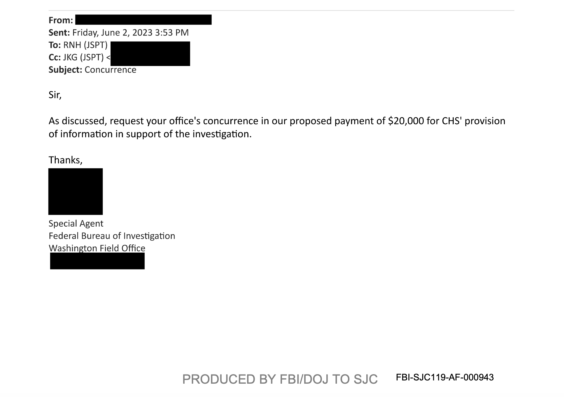 Një komunikim elektronik “dokumenton miratimin prokurorial, në formën e një emaili dakordësie nga këshilltari i Prokurorit Special, Raymond Hulser, më 02.06.2023, për një pagesë në shumën 20.000,00 dollarë për [emër i redaktuar] për informacionin e ofruar në mbështetje të hetimit të përmendur”, thuhet në një memorandum.