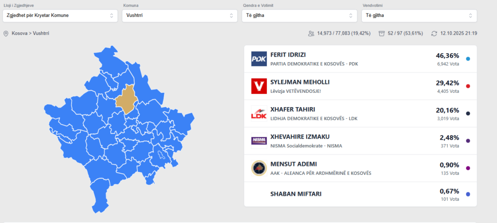 Në Vushtrri, KQZ njofton se atje është duke prirë Ferit Idrizi nga Partia Demokratike e Kosovës me 46,36% -p 6,942 Vota