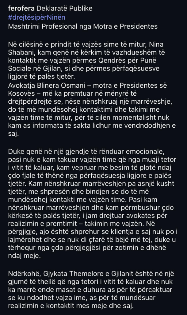 Para dy ditësh, më 15 prill, avokatja Blinera Osmani kishte pranuar se është avokate e Arbenita Ismajlit në procesin për kujdestarinë e vajzës.