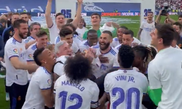 Pas vërshëllimës së fundit, filloi edhe festa te “Los Blancos”. Lojtarët e Realit e festuan titullin me prijësin e tyre, trajnerin Ancelotti.