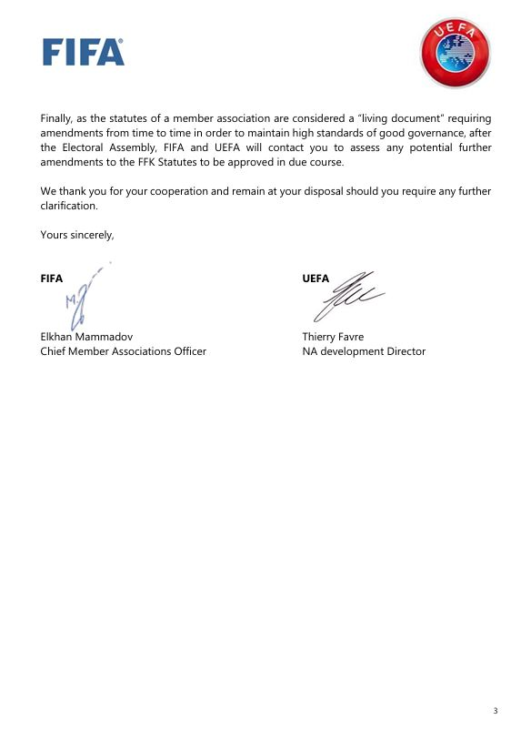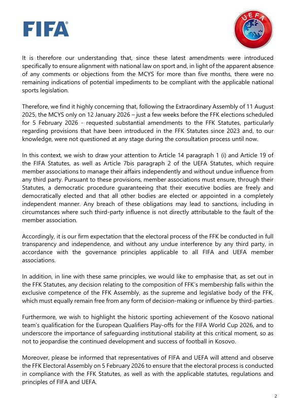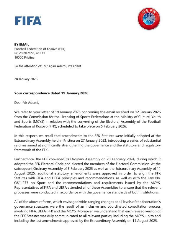 Në letrën e datës 28 janar 2026, dy institucionet më të larta të futbollit botëror dhe evropian i referohen korrespondencës së mëhershme me FFK-në dhe komunikimit të saj me Ministrinë e Kulturës, Rinisë dhe Sportit (MKRS), në lidhje me thirrjen e Kuvendit Zgjedhor.