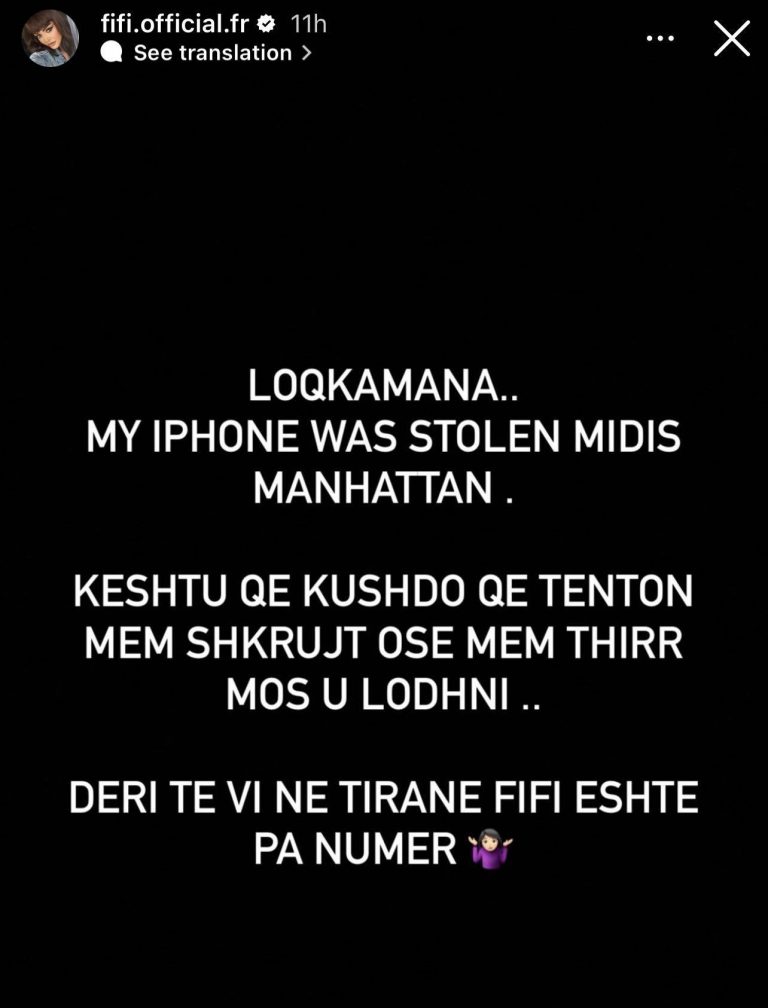 Kjo pasi që këngëtarja kosovare, Fifi, ka bërë të ditur se e ka humbur telefonin e saj gjatë qëndrimit në Manhattan, njofton Klankosova.tv.