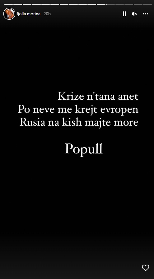 Tutje, këngëtarja Morina publikoi në InstaStory një tjetër shkrim, ku mes të tjerash shprehej: “Krizë në të gjitha anët, por neve me krejt Evropën Rusia na kish mbajtë more popull”.