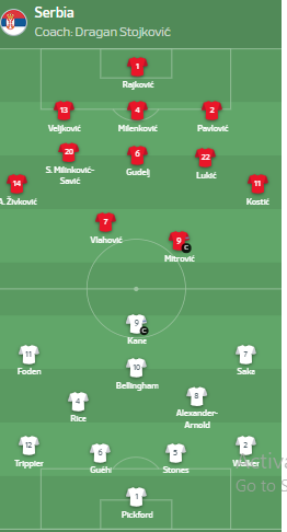 Anglia do të përballet sot me Serbinë. Ndeshja do të zhvillohet me fillim nga ora 21:00, shkruan GazetaBlic Sport. Para fillimit të takimit janë publikuar formacionet zyrtare. Ja 11’shet startuese: <img src="https://veriu.info/wp-content/uploads/2024/06/IMG_3836.jpeg" alt="" width="1536" height="864" class="aligncenter size-full wp-image-191776" /> <img src="https://veriu.info/wp-content/uploads/2024/06/IMG_3837.png" alt="" width="262" height="486" class="aligncenter size-full wp-image-191777" />