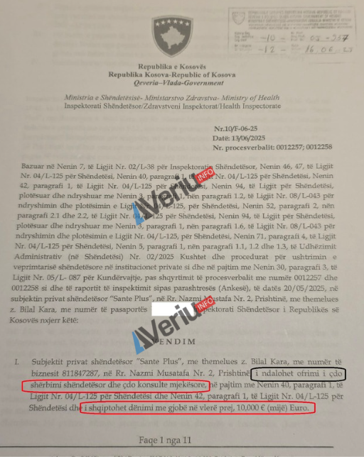 Në hulumtimin e publikuar në Veriu.info dëshmohej me dokumente dhe konfirmim zyrtar të Ministrisë së Shëndetësisë se me vendimin e Inspektoratit Shëndetësor të datës 16 qershor 2025 spitalit “Sante Plus” i ishte vendosur ndalesa e ushtrimit të çfarëdo veprimtarie shëndetësore dhe se të njëjtit i ishte ndaluar edhe promovimi apo reklamimi i çfarëdo shërbimi shëndetësor apo konsulte mjekësore.