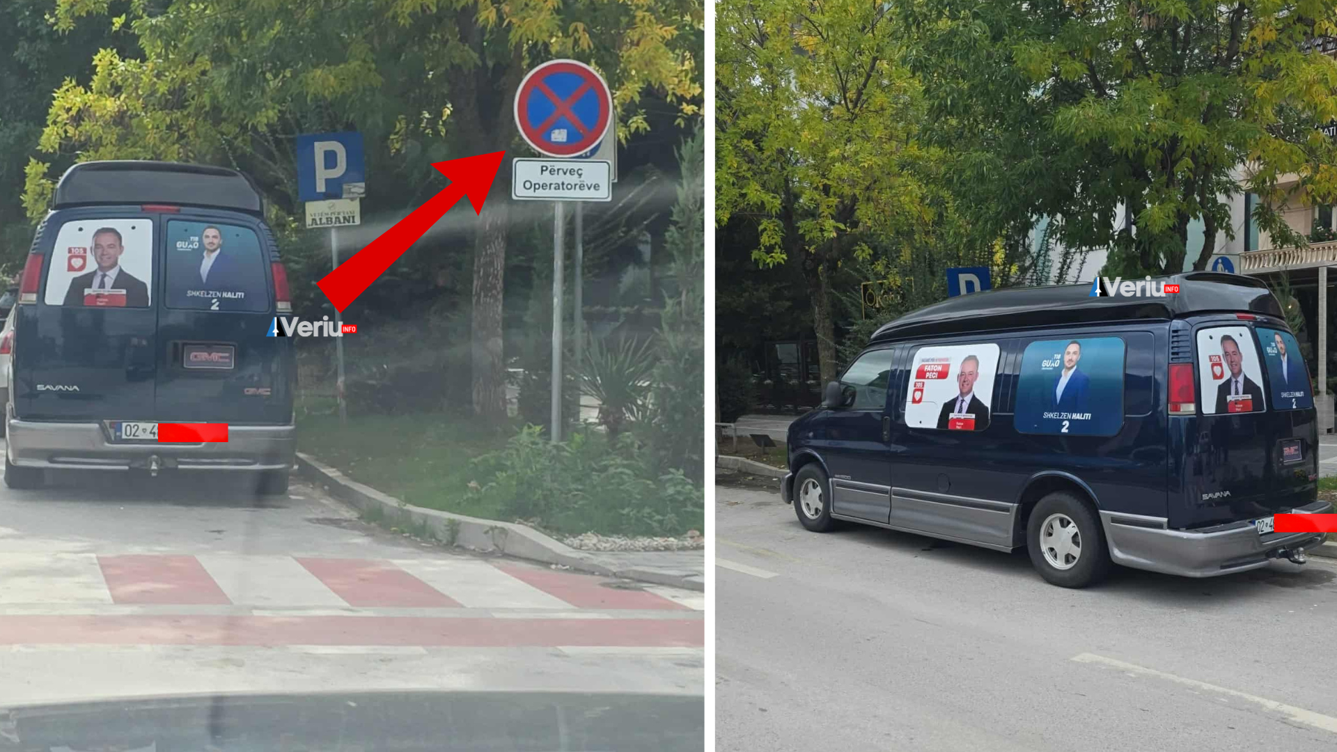 Pra, edhe pse ka shenjë ndalese për parkim, dikush e ka parkuar këtë furgon për të promovuar këta kandidat për zgjedhje.