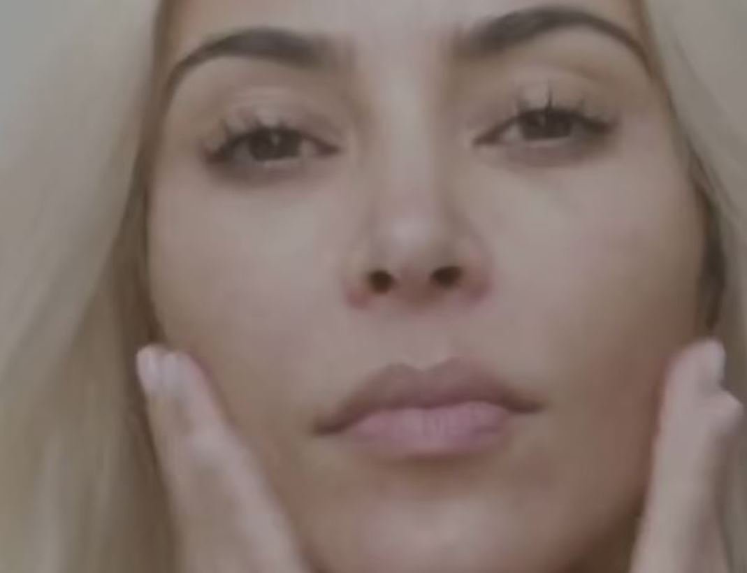 Në klip Kim u pa duke aplikuar butësisht njëri nga produktet në fytyrë dhe në qafë.