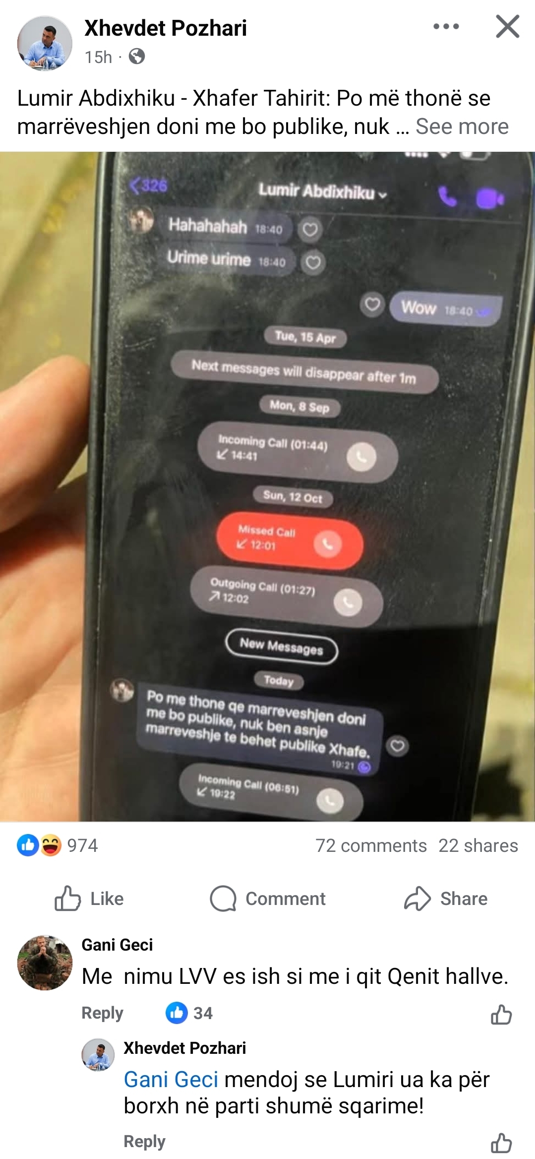 “Lumir Abdixhiku – Xhafer Tahirit: Po më thonë se marrëveshjen doni me bo publike, nuk ben asnje marrëveshje të behet publike Xhafe. Pra, siç shihet krejt paskan qenë në dijeni, veç ju paska penguar me u marr vesh në publik”, ka shkruar analisti Pozhari.