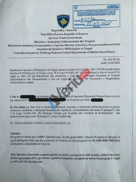 Veriu.info ka siguruar një vendim të Inspektoratit Qendror të Mbikëqyrjes së Tregut me të cilin kompania “Neptun Kosova” Sh.P.K. është gjobitur me 1 mijë euro, pasi që është zbuluar se ka shkelur Ligjin për Kërkesat Teknike të Produkteve dhe Vlerësim të Konformitetit.