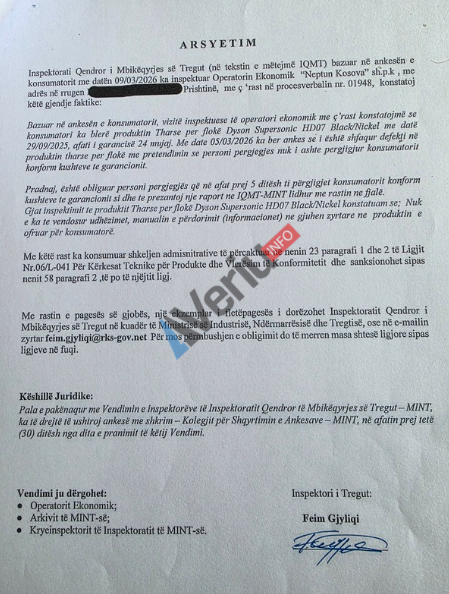 “Bazuar në ankesën e konsumatorit, vizitë inspektuese të operatori ekonomik me ç’rast konstatojmë se konsumatori ka blerë produktin Tharse per floke Dyson Supersonic HD07 Black/Nickel me datë 29/09/2025, afati i garancisë 24 muaj. Me datë 05/03/2026 ka bërë ankesë se i është shfaqur defekti në produktin tharse për flokë me pretendimin se personi përgjegjës nuk i ashte përgjigjur konsumatoril konform kushteve te garancionit”, thuhet në vendim e AIP për “Neptun Kosova”.