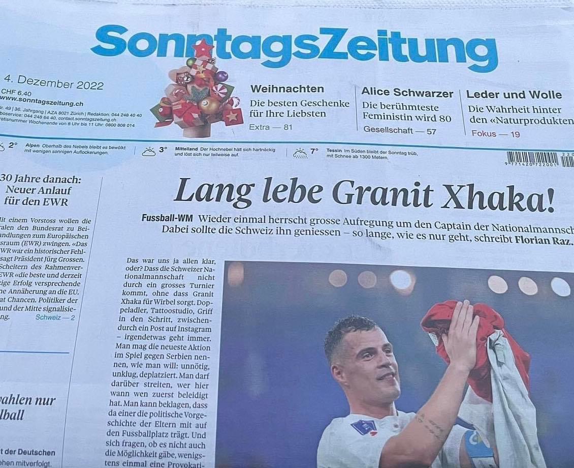 E përditshmja zvicerane and prestigjioze ‘Sonntags Zeitung’e titullon artikullin kryesor të së dielës, “Lang lebe Granit Xhaka!”, në shqip “Rrnoftë gat Granit Xhaka!”