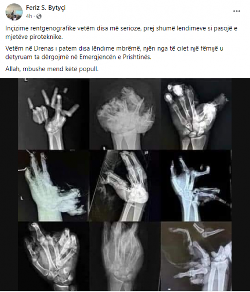 Feriz Bytyçi, mjek në Qendrën Kryesore të Mjekësisë Familjare “Dr.Hafir Shala”, në Drenas ka publikuar në Facebook disa rentgenë të rasteve të lëndimit nga mjetet pirotenike. Tha se “vetëm në Drenas i patëm disa lëndime mbrëmë.