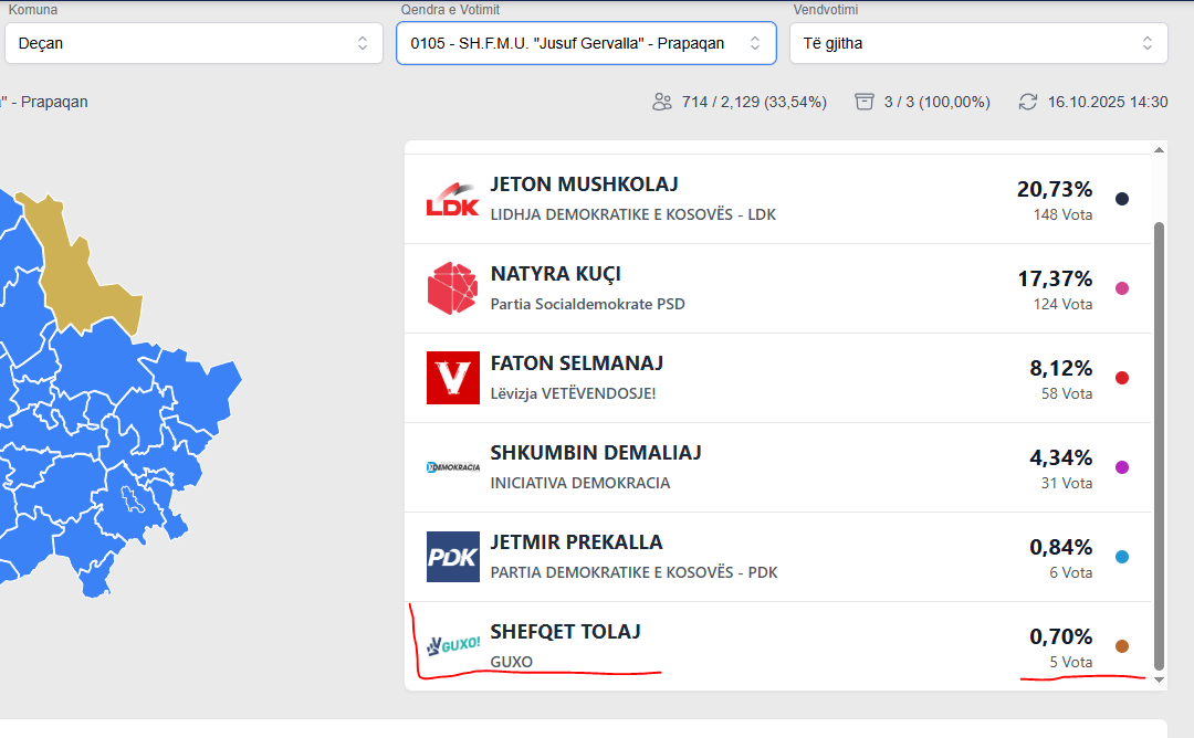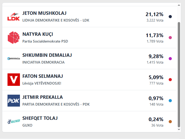 Ndërsa kandidati i “Guxo”-s për kryetar, Shefqet Tolaj, ka arritur të marrë vetëm 36 vota, ose 0.24 për qind të totalit.