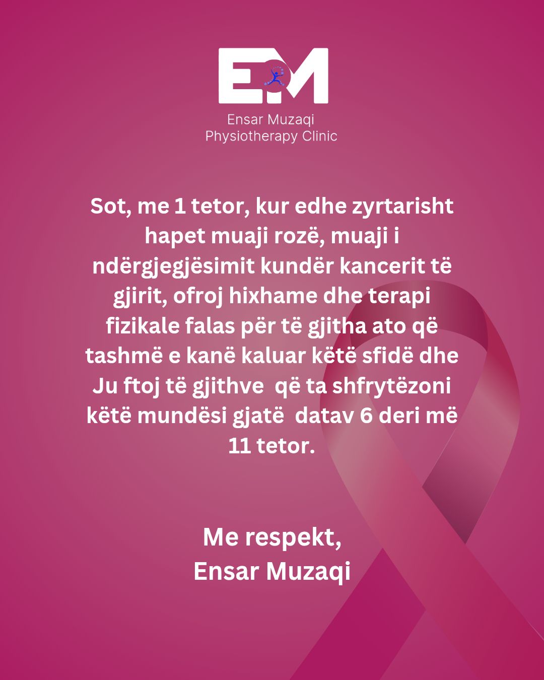 Në fillim të muajit tetor, kur nisin aktivitetet muajin rozë – një periudhë e rëndësishme për ndërgjegjësimin kundër kancerit të gjirit, fizioterapeuti Ensar Muzaqi nga Vushtrria ka ndërmarrë një nismë të veçantë humanitare.
